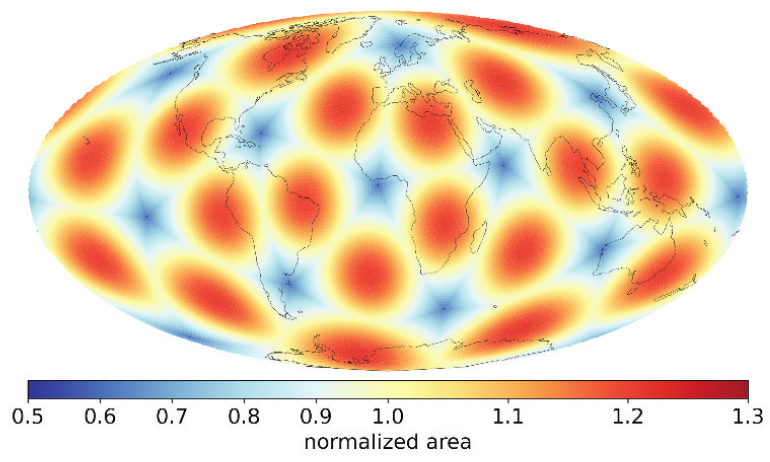 Alexander Kmoch et al. (2022) shows the global area distortion for H3. The figure shows that the zone area varies in different regions over the globe.
