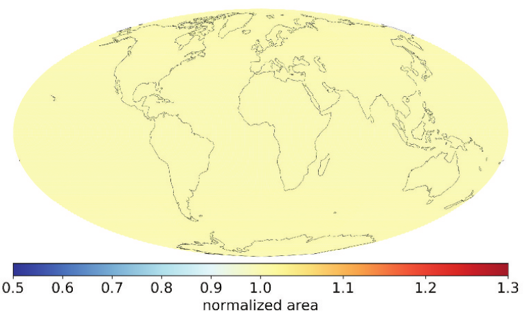 The HEALPix and rHEALPix projections are equal area for the globe at the same refinement level. Alexander Kmoch et al. (2022) studied the global area distortion of rHealpix. The following figure shows that the distortion is minimal and almost equal to the normalised area everywhere on the Earth.