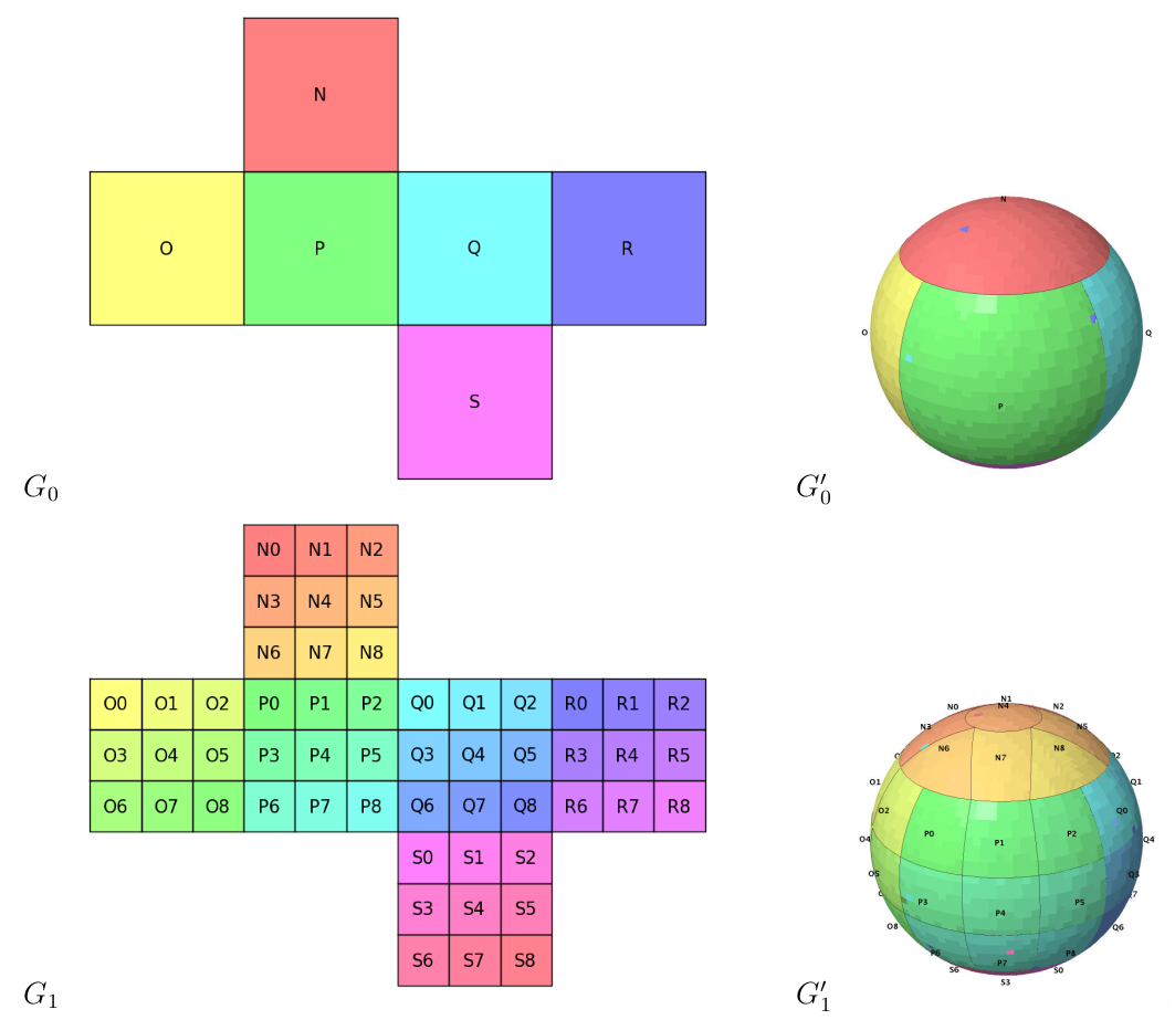 The following diagram shows how the planar square grid is inversely projected to an ellipsoid and how zones are indexed. The diagram G’1 shows the unique feature of rHEALPix - isolatitude. It is easy to see that all zone centroids align to the same latitude, and it is an important feature when performing spherical harmonic analysis.