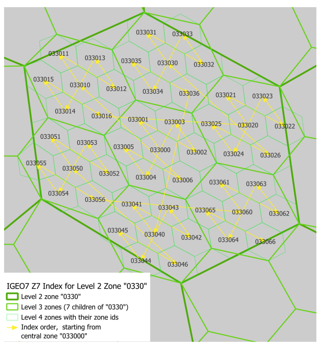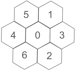 The zone ID of IGEO7 formation is similar to rHEALPix; it is a string of digits (e.g.00142352345) where the first two digits are the face ID. Each digit after the face ID represents the child zone position of the parent. The child zone is ordered according to the Central Place Indexing (CPI) hierarchy index introduced by Sahr (2019). The following figure shows how child zones are ordered to create the zone ID at each level.